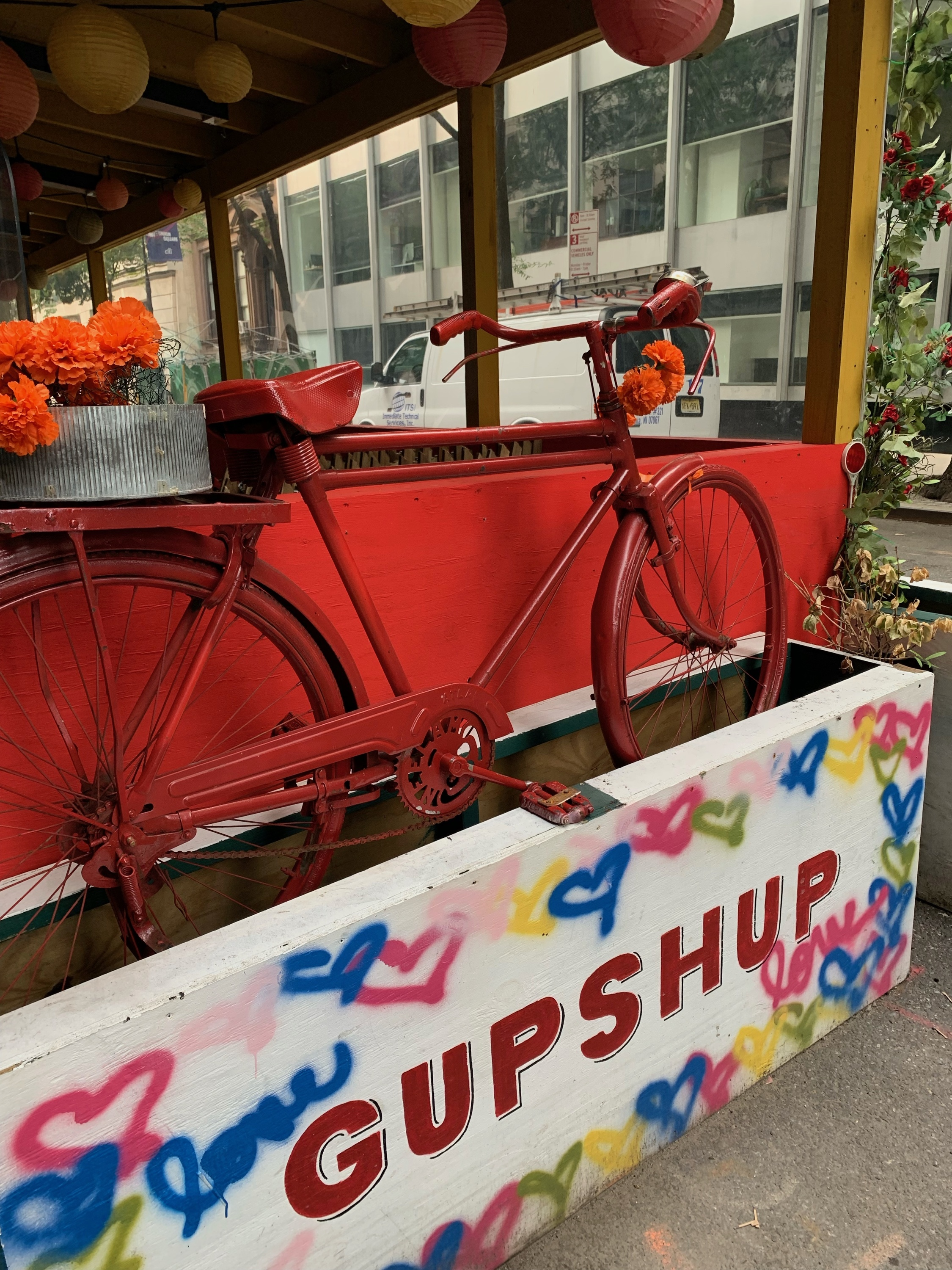 Lean back and imagine that you are on a bicycle. There isn’t any traffic, and it is a beautiful day, and you are beautiful, too, newly empowered like a person in a pharmaceutical commercial. And this isn’t just any bicycle, it is an eye-catching, primary color gem that looks like it just rolled out of the Crayola factory. It is one of the bicycles from GupShup Indian restaurant, and, even considering the whole space’s splashy design, it is The Instagram Thing.
